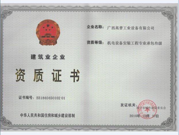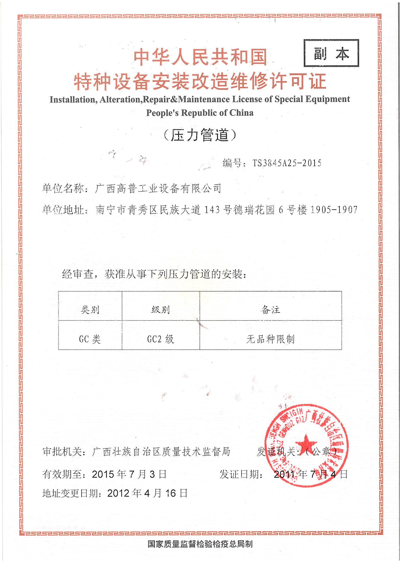本公司是高新技術(shù)企業(yè),持有國(guó)家技術(shù)監(jiān)督局頒發(fā)的1級(jí)《特種設(shè)備安裝、改造、維修(鍋爐)》許可證,1級(jí)許可證是最高級(jí)別,可安裝、改造、維修任何形式、參數(shù)的鍋爐設(shè)備。并持有《壓力管道》安裝、改造維修許可證,1級(jí)《壓力容器》安裝、改造、維修,機(jī)電設(shè)備安裝工程專業(yè)承包3級(jí)等資質(zhì)。